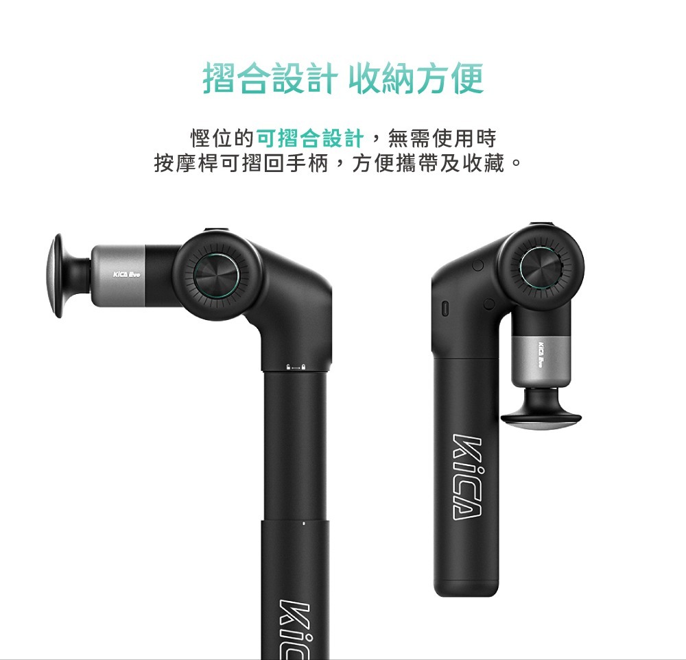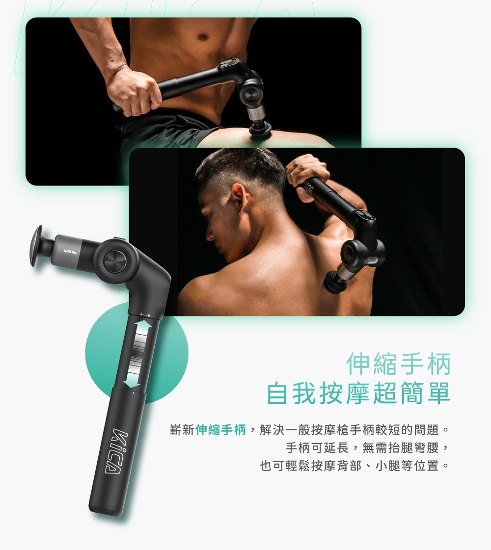 專業硏發團隊經多次測試,利用人體工學設計出KiCA Evo 多角度伸縮筋膜按摩槍。獨特L型手柄可旋轉至113度,讓你可獨自舒適地按摩背部,伸縮手柄更可觸及身體所有部位。
