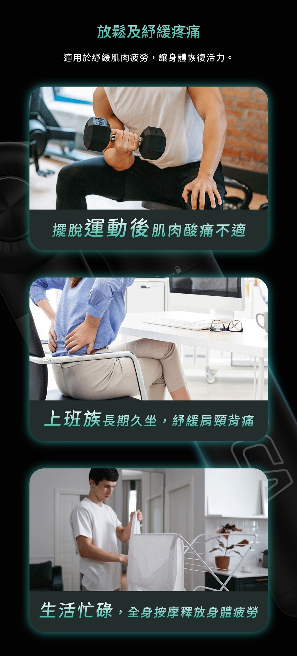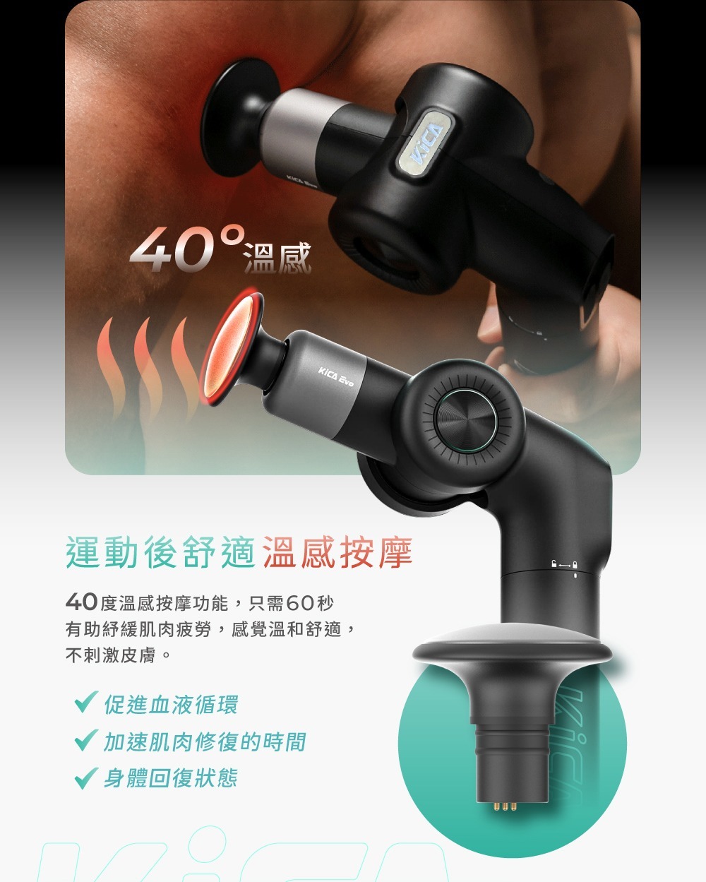 Evo按摩槍提供六種不同模式,可自選力度、準確按壓重點部位。高效摩打最高速可達3200rpm頻率及10KG 推力,使每一下按壓可深入12mm肌肉層,擊退酸痛。六款可換式按摩頭,針對身體不同部位肌肉。摩打備有40度溫感按摩功能,可促進血液循環、加速運動後肌肉恢復、身體盡快返回最佳狀態。只需按摩60秒,便可紓緩肌肉疲勞,感覺溫和舒適,不刺激皮膚。