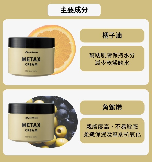 易於塗抹且不粘膩的霜狀質地,使用後皮膚光滑緊緻,解決缺水乾燥且能舒緩放鬆。