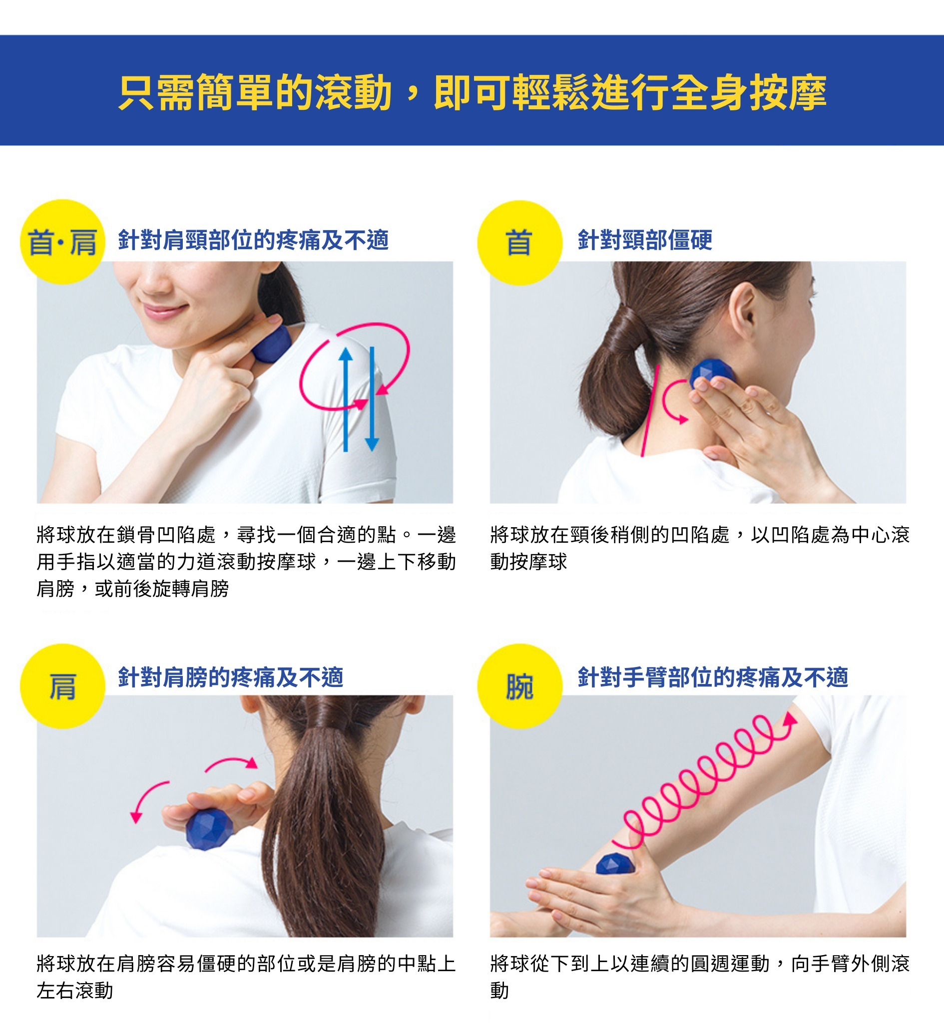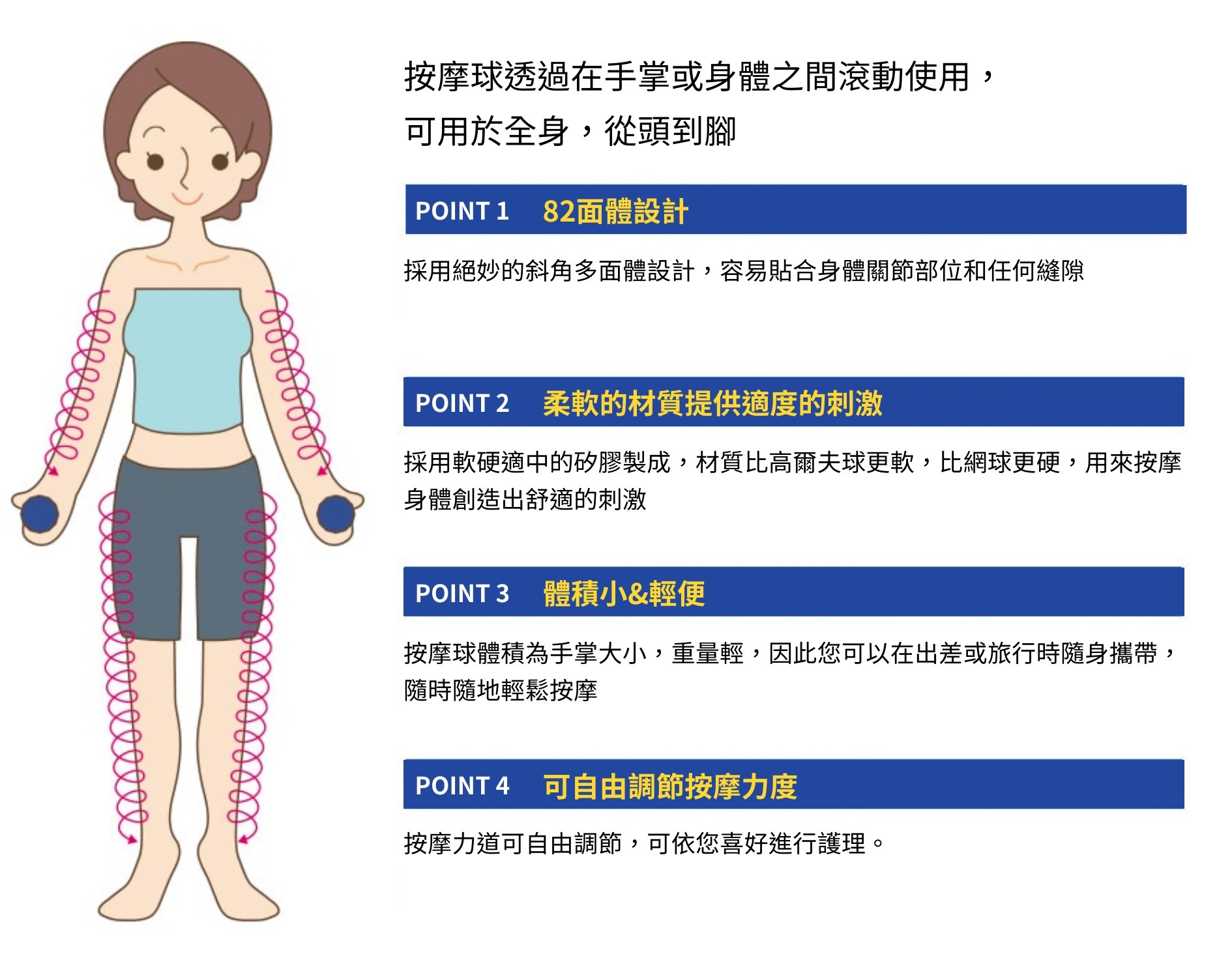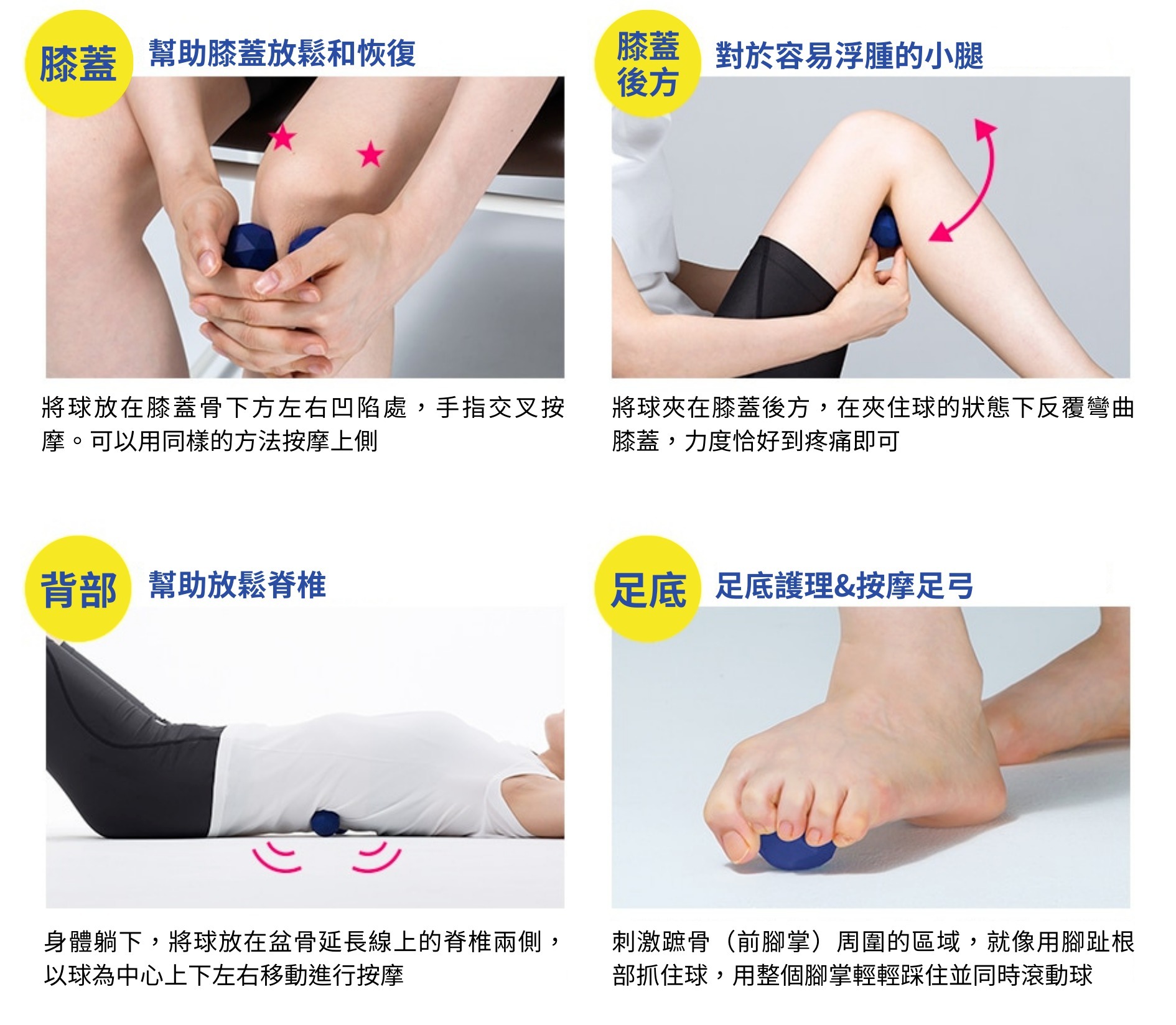 柔軟的材質提供適度的刺激,採用軟硬適中的矽膠製成,材質比高爾夫球更軟,比網球更硬,用來按摩身體創造出舒適的刺激