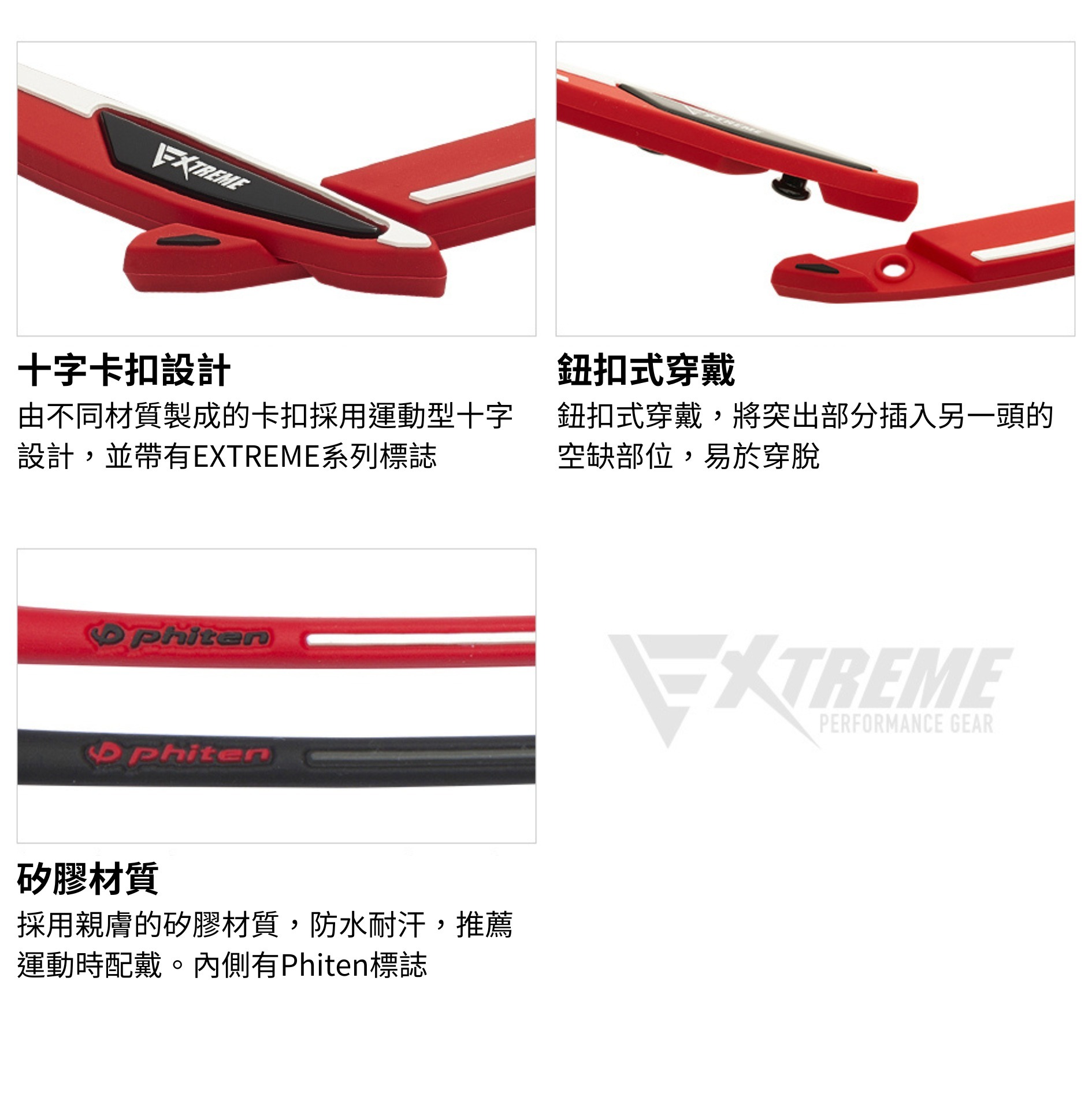 · 採用PHITEN METAX技術,利用每種金屬的特性引導身體的力量,令運動表現更佳。