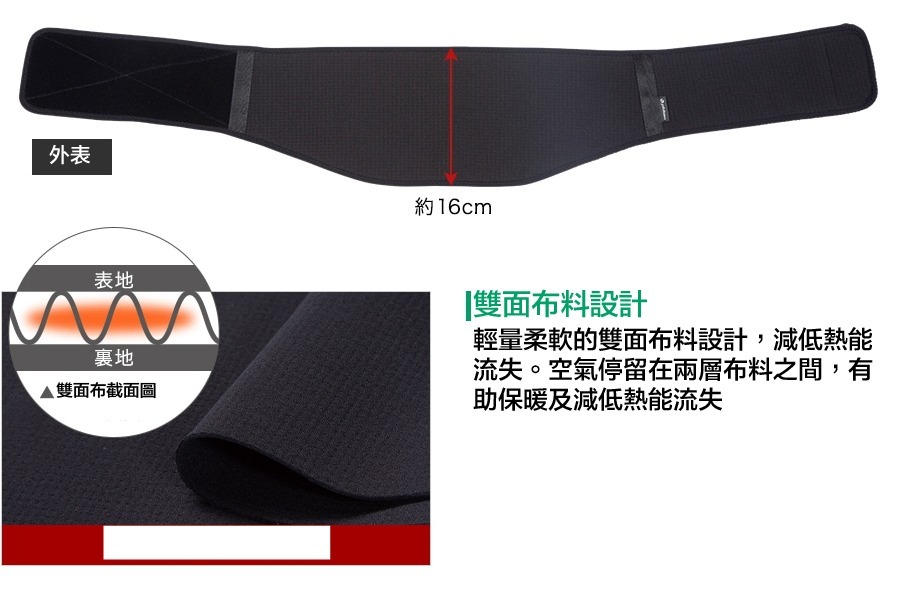 欲保護腰部使用時,穿戴時請將腰帶上緣處置放於對齊肚臍的高度位置配帶。